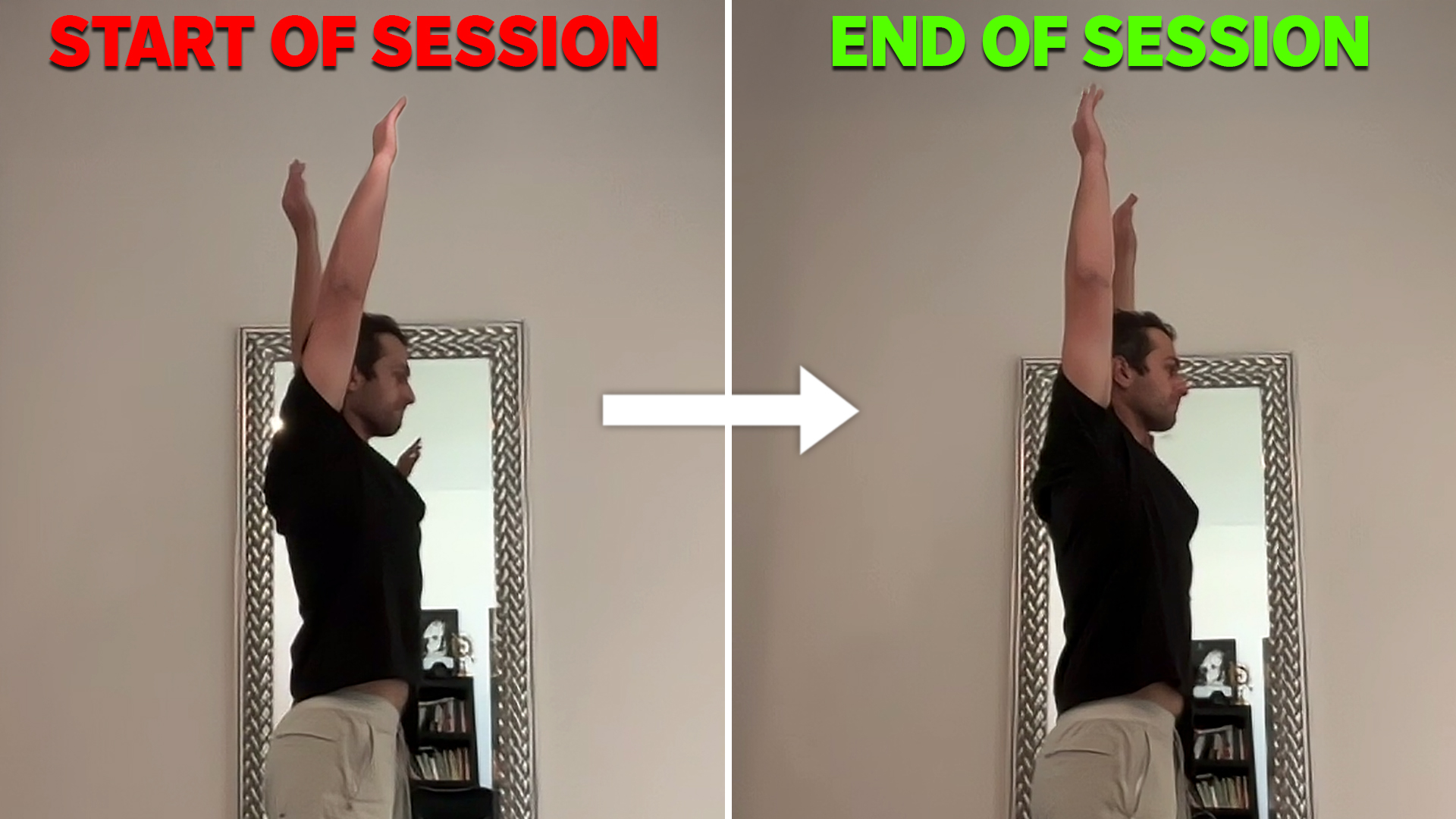 Same person, one drill, just a few minutes apart. In the top photo his shoulder was stiff and limited; in the bottom photo his shoulder motion more than doubled and his whole upper body looks more relaxed. These are the kinds of quick changes we can get with simple, coached mobility drills before we ever load you up. No more endless stretching routines.