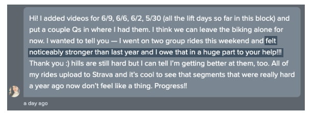 Client note from inside our coaching app: "I went on two group rides this weekend and felt noticeably stronger than last year and I owe that in a huge part to your help… segments that were really hard a year ago don’t feel like a thing. Progress!!" We track your lifts and rides over time so rides that used to wipe you out start to feel like "no big deal."